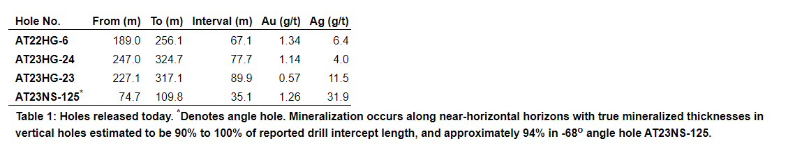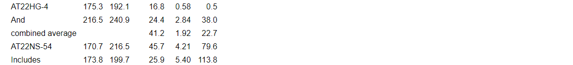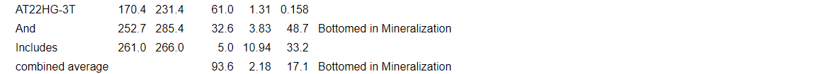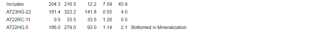 in AT22HG-6, 1.14 g/t Au over 77.7 m