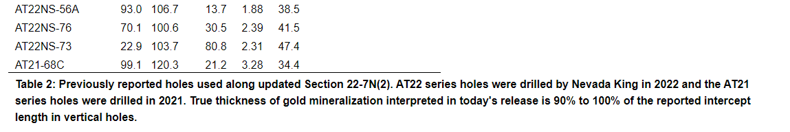 Cal Herron, exploration manager of Nevada King, stated: "The company's closer-spaced, deeper holes and attention to high-angle, higher-grade feeder structures is paying off. There are five historical holes drilled in the WAGZ along Section 22-7N(2) that encountered mineralization and average 0.96 g/t gold equivalent over 87.1 m thickness. The same section length now includes seven Nevada King holes with an average grade of 2.07 g/t AuEq over 76.1 m thickness, representing a 116-per-cent increase in grade. The WAGZ is an important target where thick mineralization can rapidly add ounces to the resource, and we look forward to the receipt of additional results."