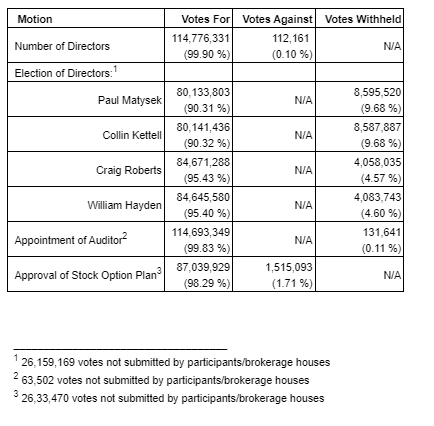 Votes representing 114,888,492 shares, or 36.51 per cent, of the issued and outstanding shares of the company as at the record date were cast. An attached table details the results.