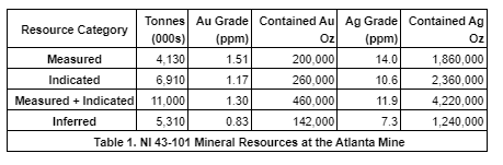 The Atlanta mine is a historical gold-silver producer with an NI 43-101 compliant pit-constrained resource of 460,000 ounces gold in the measured and indicated category (11.0 million tonnes at 1.3 grams per tonne) plus an inferred resource of 142,000 ounces gold (5.3 million tonnes at 0.83 gram per tonne) (see the NI 43-101 technical report on resources titled "Atlanta Property, Lincoln County, NV," with an effective date of Oct. 6, 2020, and a report date of Dec. 22, 2020, as prepared by Gustavson Associates and filed under the company's profile on SEDAR+).