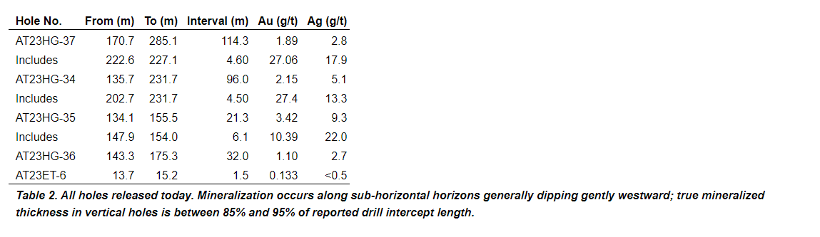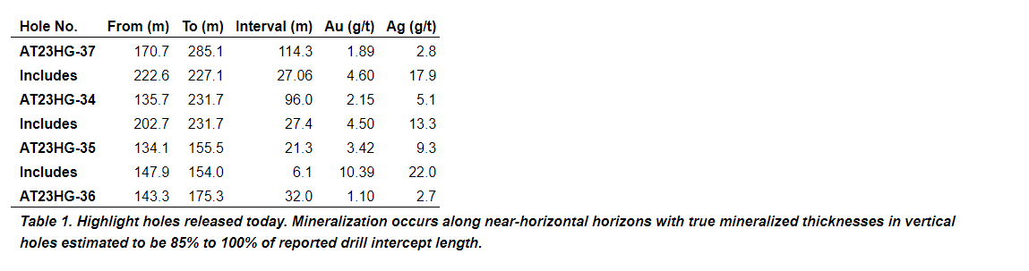 AT23HG-37 was collared 36 m west of AT23HG-34 in the Eureka quartzite and drilled through 170 m of barren, Ordovician-age quartzite before intersecting Tertiary-age, volcanic-hosted mineralization returning 1.89 g/t Au over 114.3 m, including 27.06 g/t Au over 4.6 m.