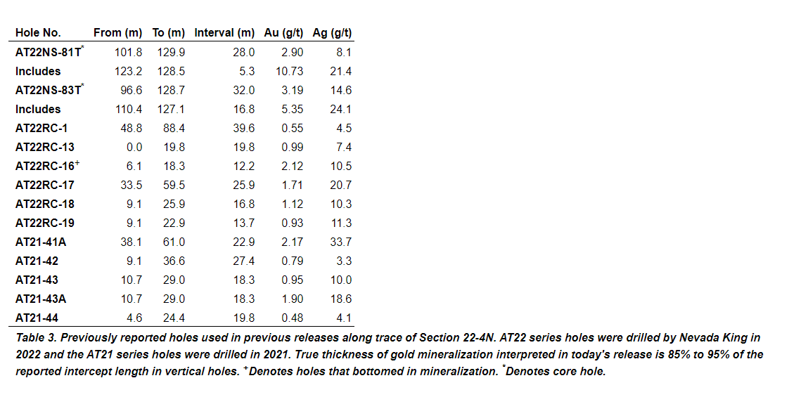 Cal Herron, exploration manager of Nevada King, stated: "Nevada King's vertical holes released today (averaging 2.05 g/t gold equivalent over 105.2 m thickness) paint a much-brighter picture of the potential of the SQRT than the historical angle holes (averaging 1.64 g/t AuEq over 26.3 m thickness) which mostly missed the mineralized horizon and reaffirmed the historical misconception that the south fault terminated mineralization at Atlanta. Today's AT23HG-37 could prove a significant development for resource potential at Atlanta should mineralization ultimately continue southward along trend of the SQRT. Similar intersections of gold mineralization found south of Section 22-4N would have a marked impact on the resource potential at Atlanta by increasing mineralized tonnage and reducing the overall strip ratio in a potential future mining scenario. The company is currently constructing drill pads south of Section 22-4N to test the southern extension of the 100 m thick, high-grade, oxidized replacement horizon found in today's drilling, with an eye on tracing the mineralization down to and possibly beyond the Atlanta Peak fault along the axis of the Quartzite Ridge anticline. These new results mark a major departure from the historical interpretation at Atlanta, opening up the potential for a larger mineralized system."