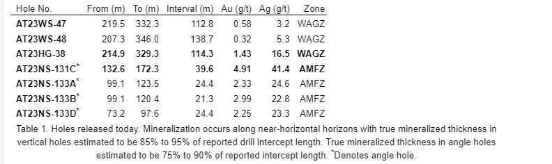 114.3 m grading 1.43 g/t Au, while a previously released nearby hole, AT23HG-5, bottomed in mineralization and returned 93 m grading 1.14 g/t. This deeper drilling in AT23HG-38 reveals significantly stronger grade and thickness compared with the earlier drilling.
