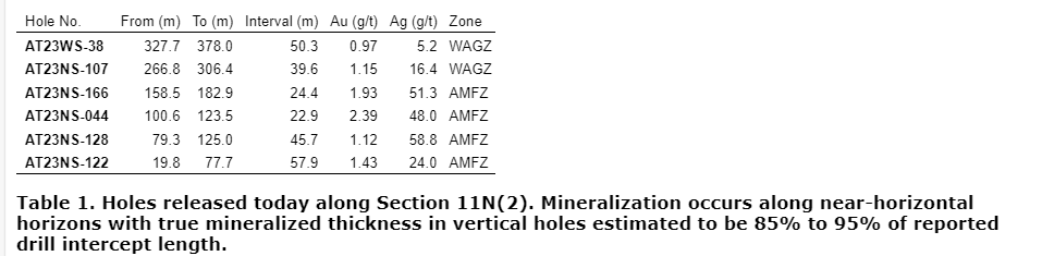 - AT23NS-107 (39.6 m at 1.15 g/t Au) was a 17 m stepout to the south from previously released AT23NS-106 (41.2 m at 0.84 g/t Au) to test for lateral continuity of grade and thickness within the same fault block. These intercepts exhibit close agreement in grade, thickness and intercept depth, adding confidence to the company's understanding of the structural controls on the mineralization.