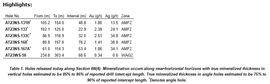 in AT23NS-168 and 1.86 g/t Au and 34.1 g/t Ag over 53.4 m