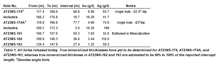 in AT23NS-174 and 4.9 g/t Au and 75.0 g/t Ag over 77.7m