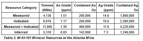 The Atlanta Mine is a historical gold-silver producer with a NI 43-101 compliant pit-constrained resource of 460,000 oz Au in the measured and indicated category (11.0M tonnes at 1.3 g/t) plus an inferred resource of 142,000 oz Au (5.3M tonnes at 0.83 g/t). See the NI 43-101 Technical Report on Resources titled "Atlanta Property, Lincoln County, NV" with an effective date of October 6, 2020, and a report date of December 22, 2020, as prepared by Gustavson Associates and filed under the company's profile on SEDAR+ (www.sedarplus.ca).