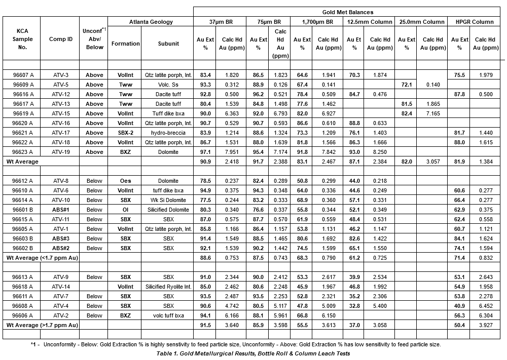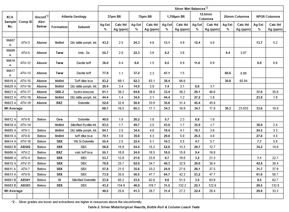 A breakout of the materials tested above and below the Atlanta unconformity and the laboratory metallurgy gold extraction test results are summarized in Table 1. A full range of rock types at Atlanta have been tested and test results clearly show the significant metallurgical difference between the silicified breccias and the volcanics. A similar table summarizing silver extractions for Atlanta can be found in Table 2.