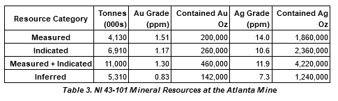 The Atlanta Mine is a historical gold-silver producer with a NI 43-101 compliant pit-constrained resource of 460,000 oz Au in the measured and indicated category (11.0M tonnes at 1.3 g/t) plus an inferred resource of 142,000 oz Au (5.3M tonnes at 0.83 g/t). See the NI 43-101 Technical Report on Resources titled "Atlanta Property, Lincoln County, NV" with an effective date of October 6, 2020, and a report date of December 22, 2020, as prepared by Gustavson Associates and filed under the Company's profile on SEDAR+ (www.sedarplus.com).