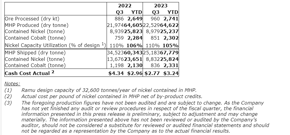 Ramu Q3 2023 production of 8,979 tonnes of contained nickel in mixed hydroxide precipitate (MHP), compared with 8,939 tonnes in Q3 2022;