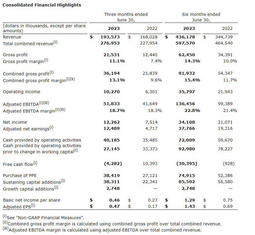 - Reported revenue of $193.6-million, compared with $168.0-million in the same period last year, was generated primarily by the equipment fleet in the oil sands region. When comparing with Q2 2022, the revenue increase included full quarter impacts of updated equipment rates and the acquisition of ML Northern Services Ltd.