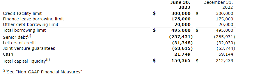 The company's current liquidity positions it well moving forward to finance organic growth and the required correlated working capital investments. Including equipment financing availability and factoring in the amended credit facility agreement, total available capital liquidity of $159.4-million includes total liquidity of $120.4-million and $27.3-million of unused finance lease borrowing availability as at June 30, 2023. Liquidity is primarily provided by the terms of the company's $300.0-million credit facility which allows for funds availability based on a trailing-12-month EBITDA as defined in the agreement and is now scheduled to expire in October, 2025.