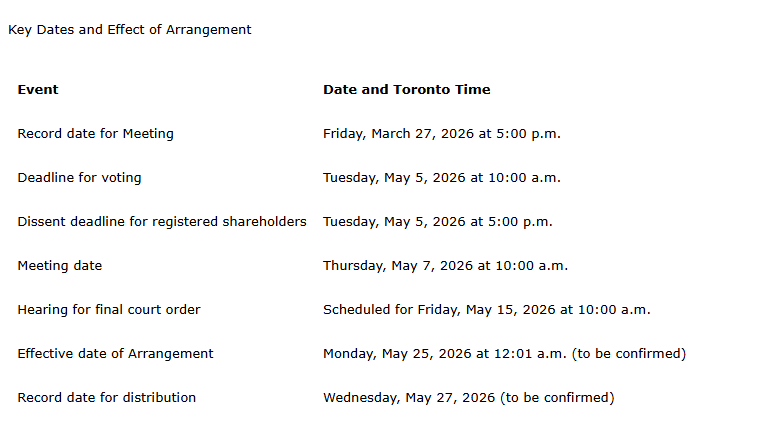 The arrangement requires final approval of the Ontario Superior Court of Justice (Commercial List). If the arrangement resolution is approved at the meeting, the company expects to make an application for a final order from the Ontario Superior Court of Justice (Commercial List) approving the arrangement. It is anticipated that the hearing for the final court order will be held on May 15, 2026, at 10 a.m. (Toronto time), or on a date (and at a time) close to that date and time. Completion of the arrangement is subject to the fulfilment of all requirements imposed by the TSX-V, as well as those in the court's final order.