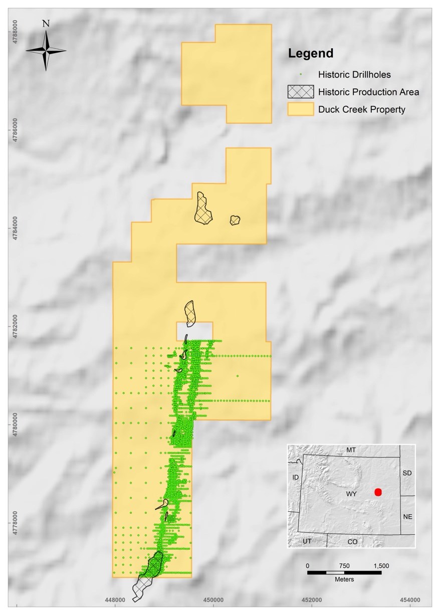 Importantly, the expanded trend extends toward Uranium Energy Corp.'s nearby Barge Project, which hosts a reported resource of approximately 4.36 million pounds U₃O₈1, and lies along the same corridor as Cameco's Smith Ranch–Highland complex with a resource of 32 million pounds U₃O₈2 and historical production of over 23 million pounds U₃O₈3. Control of this expanded trend significantly enhances the strategic and exploration value of Duck Creek.