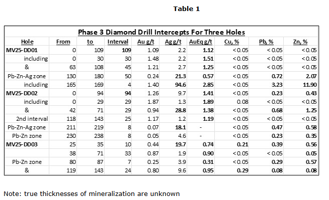 Anomalous copper mineralization (0.21 per cent average) is coincident with the upper gold intercept for DD-03 (Choque zone). In addition, primarily lead-zinc mineralization has been intersected at downhole depths of 80 to 87 metres and 119 to 143 metres.