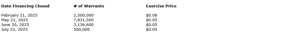 Pursuant to the terms of the 2025 warrants, the company may accelerate the expiry date of 2.5 million 2025 warrants if the daily volume weighted average price (VWAP) of the company's common shares on the Canadian Securities Exchange equals or exceeds 12 cents for 10 consecutive trading days, and 11,468,100 2025 warrants if the daily VWAP of the company's common shares on the CSE equals or exceeds eight cents for 10 consecutive trading days, to the date that is 30 days following the dissemination of a news release announcing the acceleration. As of the close on Jan. 20, 2026, the company's common shares have equaled or exceeded a daily VWAP of 12 cents per share over each of the last 10 trading days on the CSE and hereby provides notice of the acceleration period in accordance with the terms of the 2025 warrants. The company is exercising its right to accelerate the expiry of the 2025 warrants originally issued under the financings to 5 p.m. Vancouver time on Nov. 21, 2025.