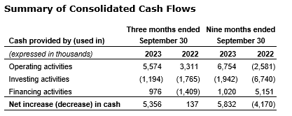 - Cash provided by operating activities in the third quarter of 2023 of $5.6-million, a $2.3-million increase from the $3.3-million cash provided by operating activities in the third quarter of 2022;