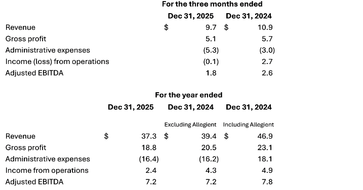 Income (loss) from operations was ($100,000) in Q4 2025, a 105-per-cent decrease from $2.7-million in Q4 2024 and was $2.4-million in FY 2025, a 45-per-cent decrease from $4.3-million FY 2024 driven by an increase in share-based compensation expense.