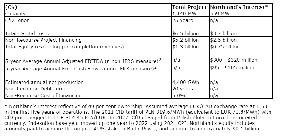 "This financing is Northland's first offshore wind project in Poland," said Pauline Alimchandani, Northland's chief financial officer. "We would like to thank all stakeholders for working together to achieve this significant milestone. Once operational, Baltic Power will be Northland's fourth offshore wind project in Europe and will provide significant high-quality, inflation-protected, long-term contracted adjusted EBITDA [earnings before interest, taxes, depreciation and amortization] and free cash flow to our business and shareholders."