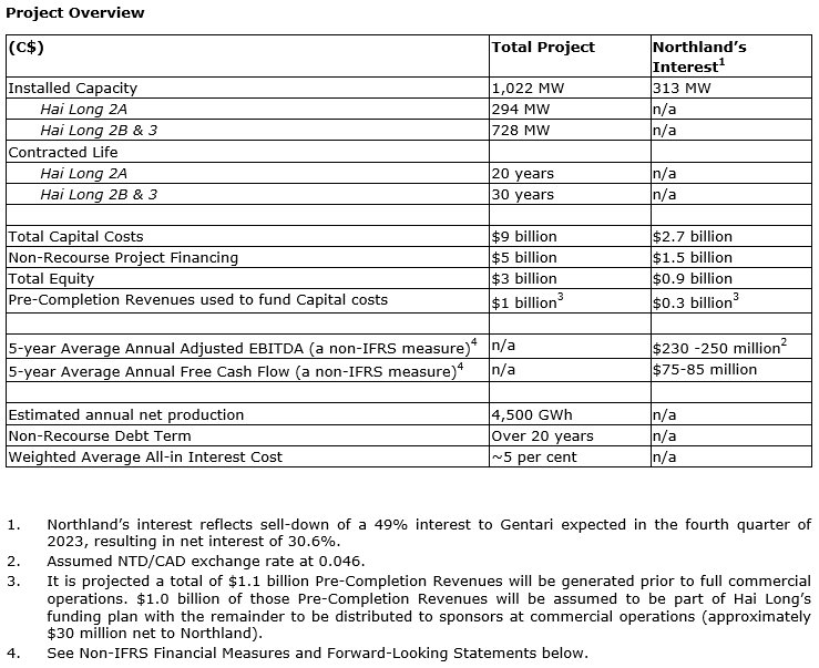 "This financing is Northland's first in Asia and, once closed, will be the largest non-recourse offshore wind project financing to date in the region," said Pauline Alimchandani, Northland's chief financial officer. "We would like to thank the project team, our partners, and all the financial and capital providers for working together to achieve this significant milestone. Once operational, Hai Long is expected to provide significant, long-term contracted adjusted [earnings before interest, taxes, depreciation and amortization] and free cash flow to our business and shareholders."