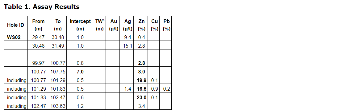 Hole WS02 was drilled in 2017. Noteworthy is the fact that the hole was drilled without the benefit of any modern techniques to target anomalies (like numerous types of geophysics); it was a real wildcat hole. The fact that several significant new mineralized zones were identified bodes well for future exploration. Also noteworthy is the lack of historical zinc production from the property workings. It is possible that because it has been oxidized above the water table and thus is difficult to identify (generally white minerals in a white host rock), there are substantial amounts of zinc present.