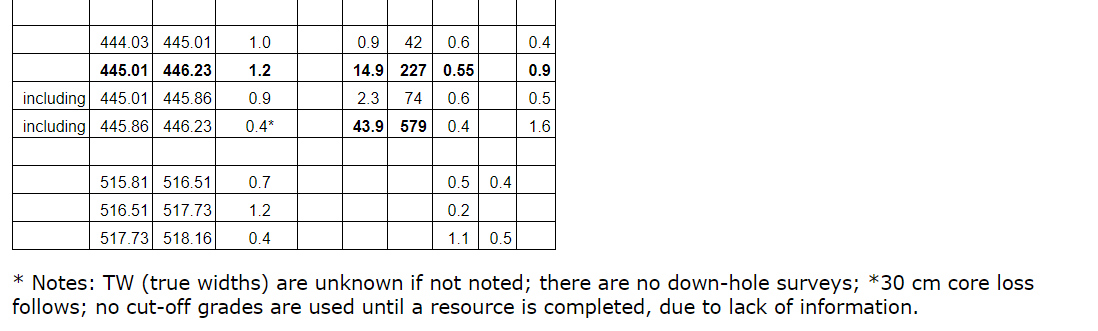 14.9 grams per tonne gold, 227 g/t silver, 0.9 per cent lead and 0.55 per cent zinc over 1.2 metres from 444.0 m down hole, which included 49 g/t Au, 579 g/t Ag, 1.6 per cent Pb and 0.4 per cent Zn over 0.4 m (there were 30 centimetres of core loss after this very-high-grade section);