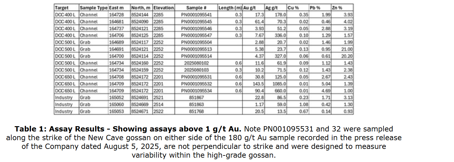 - 90.4 g/t Au, 660 g/t Ag, 4.69 per cent Pb, 1.00 per cent Zn over 0.6 m (650 L).