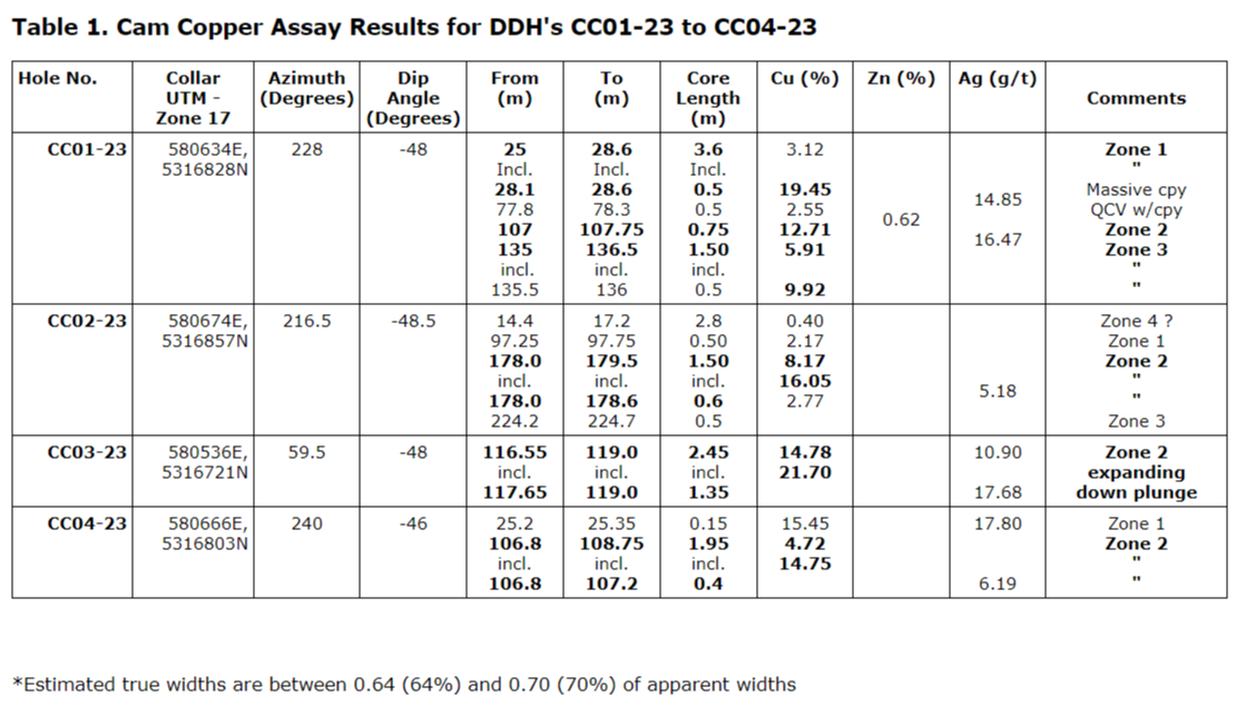 - 3.12 per cent Cu over 3.6m from 25.0 m to 28.6 m, including 19.45 per cent Cu and 14.85 grams per tonne silver over 0.5 m from 28.1 m to 28.6 m in CC01-23 (previously reported);