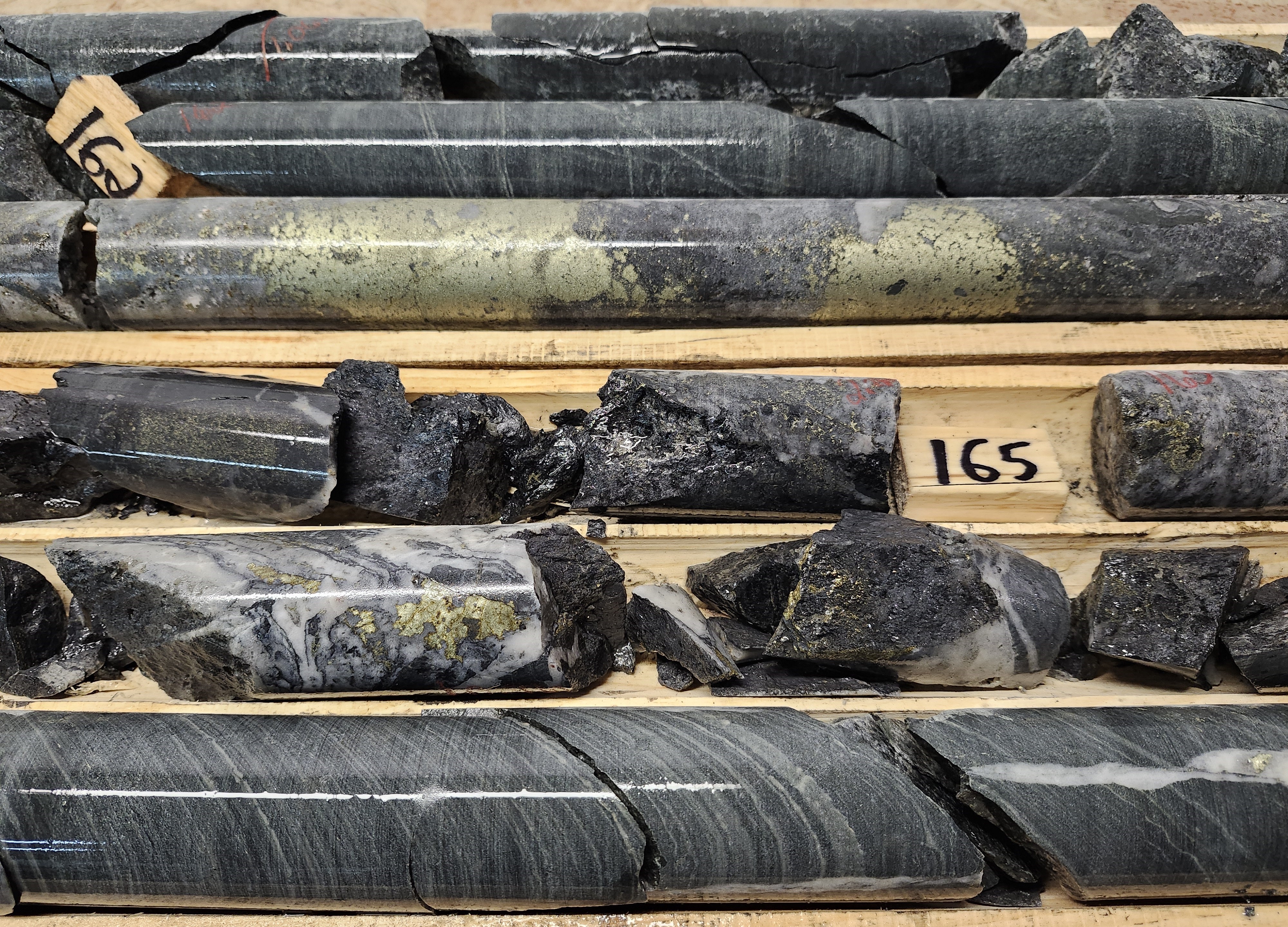 Photo 3. Massive and Stringer Bornite and Chalcopyrite with Au and Ag in Zone 2 (DDH CC-25-16)
