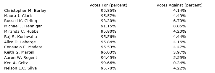 Nutrien's 12 director nominees were elected as shown in the attached table.