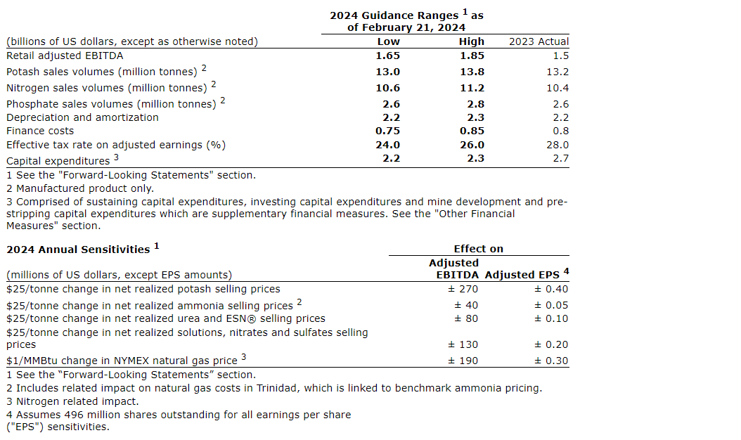 "As we look ahead to 2024, we expect to deliver higher fertilizer sales volumes and retail earnings, supported by increased crop input market stability and demand. We continue to prioritize strategic initiatives that enhance our capability to serve growers in our core markets, maintain the low-cost position and reliability of our assets, and position the company for growth," added Mr. Seitz.