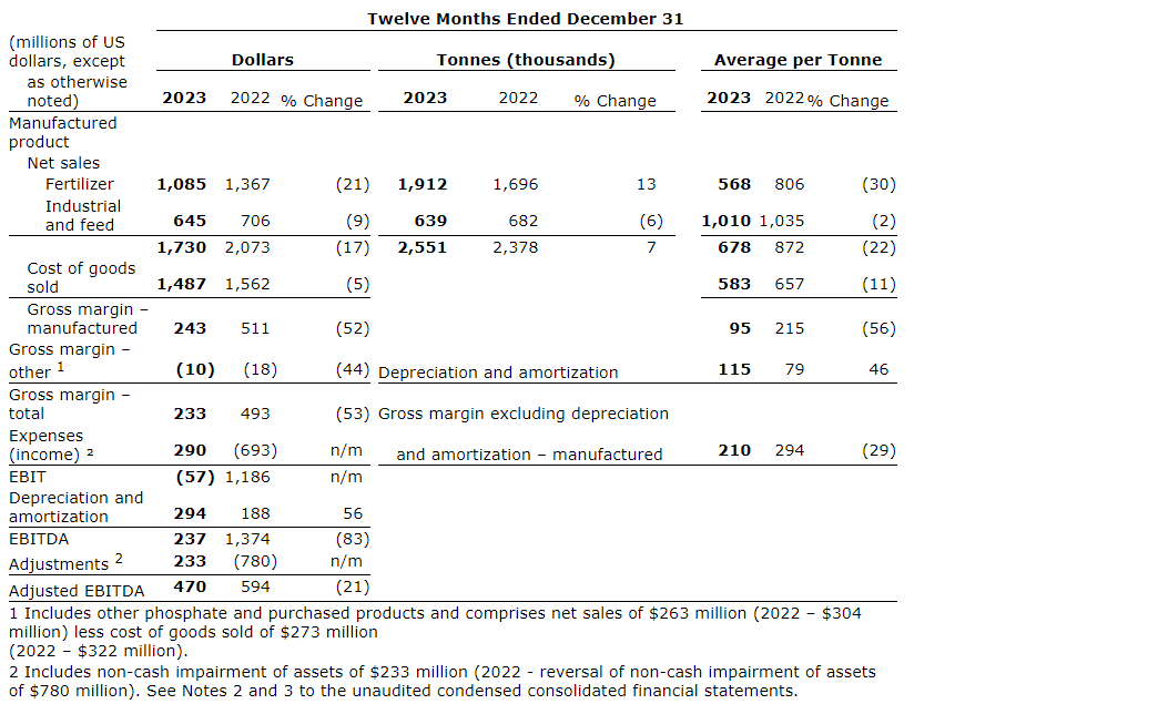 Phosphate adjusted EBITDA increased in the fourth quarter of 2023 primarily due to lower sulphur and ammonia input costs, partially offset by lower net realized selling prices. Full year 2023 adjusted EBITDA was lower compared with the prior year mainly due to lower net realized selling prices for fertilizer products, partially offset by lower ammonia and sulphur input costs. Included in the expenses for the full year of 2023, the company recognized a $233-million non-cash impairment of its White Springs property, plant and equipment, while the company had non-cash impairment reversals of the company's phosphate assets of $780-million for the full year of 2022.