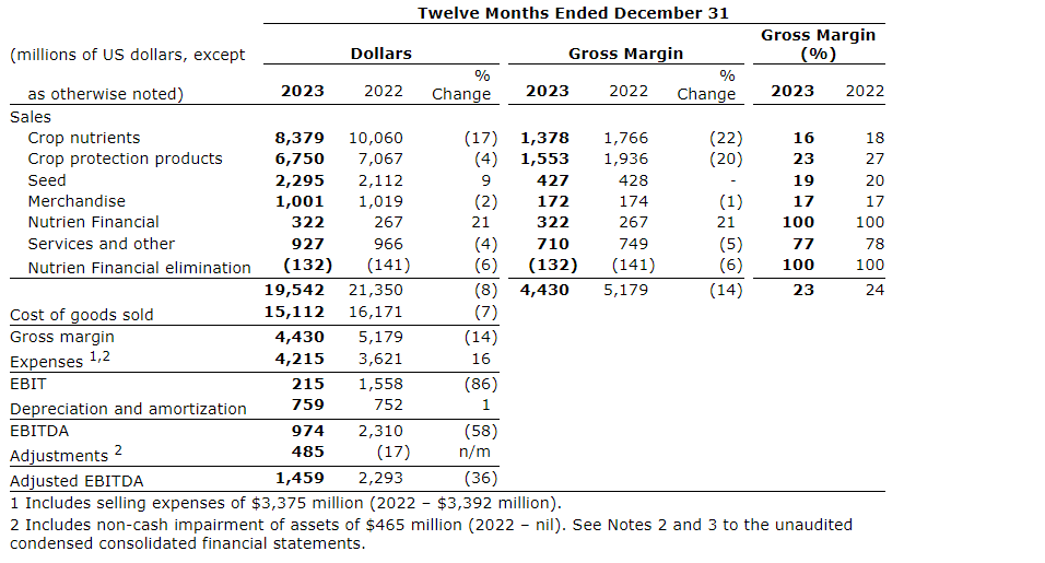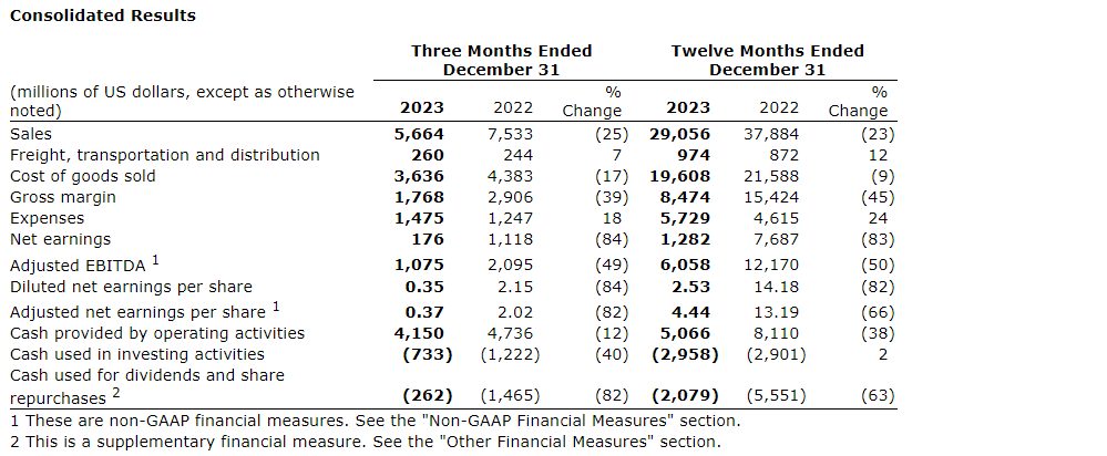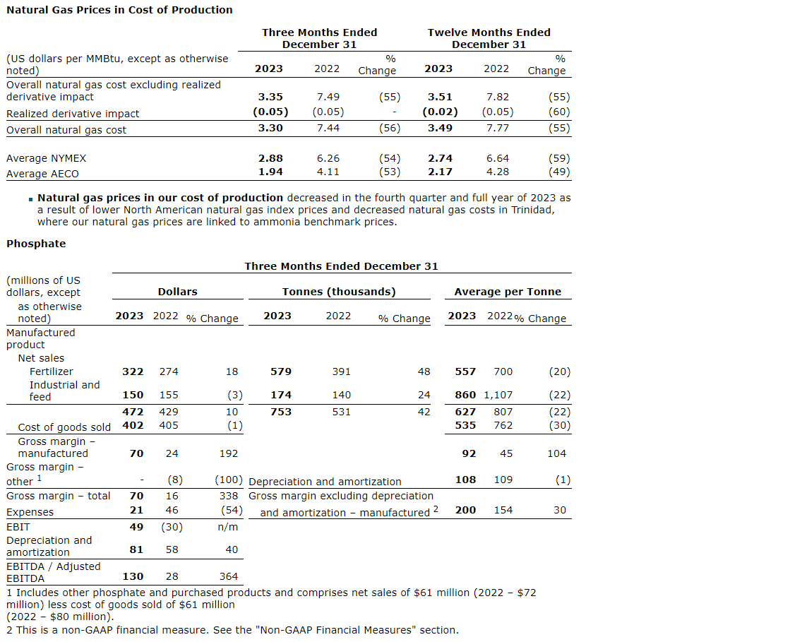 Net earnings and adjusted EBITDA decreased in the fourth quarter and full year of 2023 compared with the same periods in 2022, mainly due to lower net realized selling prices across all segments and lower retail earnings. This was partially offset by decreased cost of goods sold from lower natural gas and royalty costs, lower provincial mining taxes, higher sales volumes for retail crop nutrients, and increased potash and nitrogen sales volumes. For the full year of 2023, the company recorded non-cash impairment of assets of $774-million in aggregate primarily related to retail -- South America goodwill and nitrogen and phosphate property, plant and equipment, resulting in lower net earnings. For the full year of 2022, the company recorded a non-cash impairment reversal of an aggregate of $780-million related to the company's phosphate assets. The decrease in cash provided by operating activities in the fourth quarter and full year 2023 compared with the same periods in 2022 was primarily due to lower earnings across all segments.