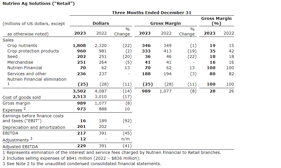 Retail adjusted EBITDA decreased in the fourth quarter of 2023 primarily due to lower gross margin for crop protection products and higher expenses. For the full year, adjusted EBITDA was lower mostly due to lower gross margin for both crop nutrients and crop protection products. Included within expenses for the full year of 2023, the company recognized a $465-million non-cash impairment primarily related to goodwill of its South American retail assets. The impairment was mainly due to the impact of crop input price volatility, more moderate long-term growth assumptions and higher interest rates.