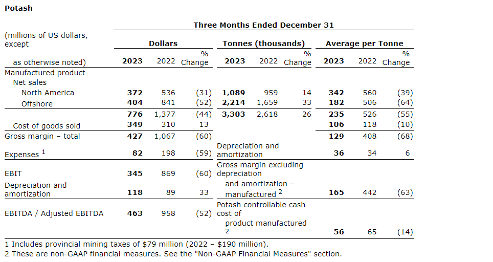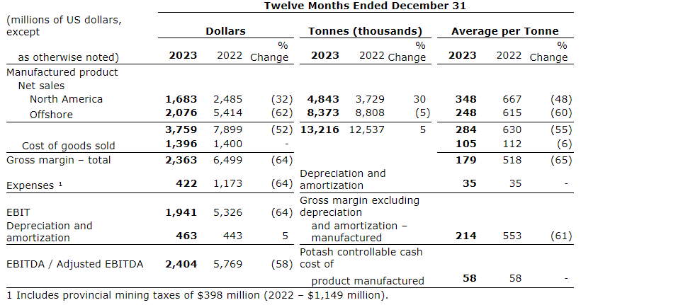 Potash full year 2023 adjusted EBITDA declined to $2.4-billion due to lower net realized selling prices. The company delivered record fourth quarter potash sales volumes driven by strong demand in North America and increased offshore sales.