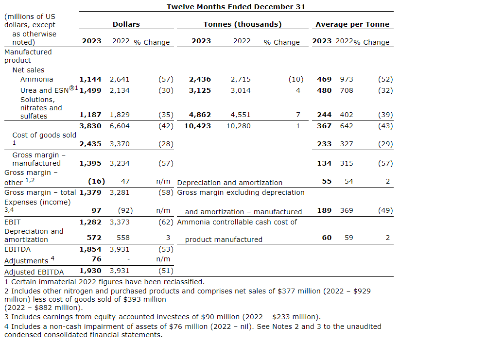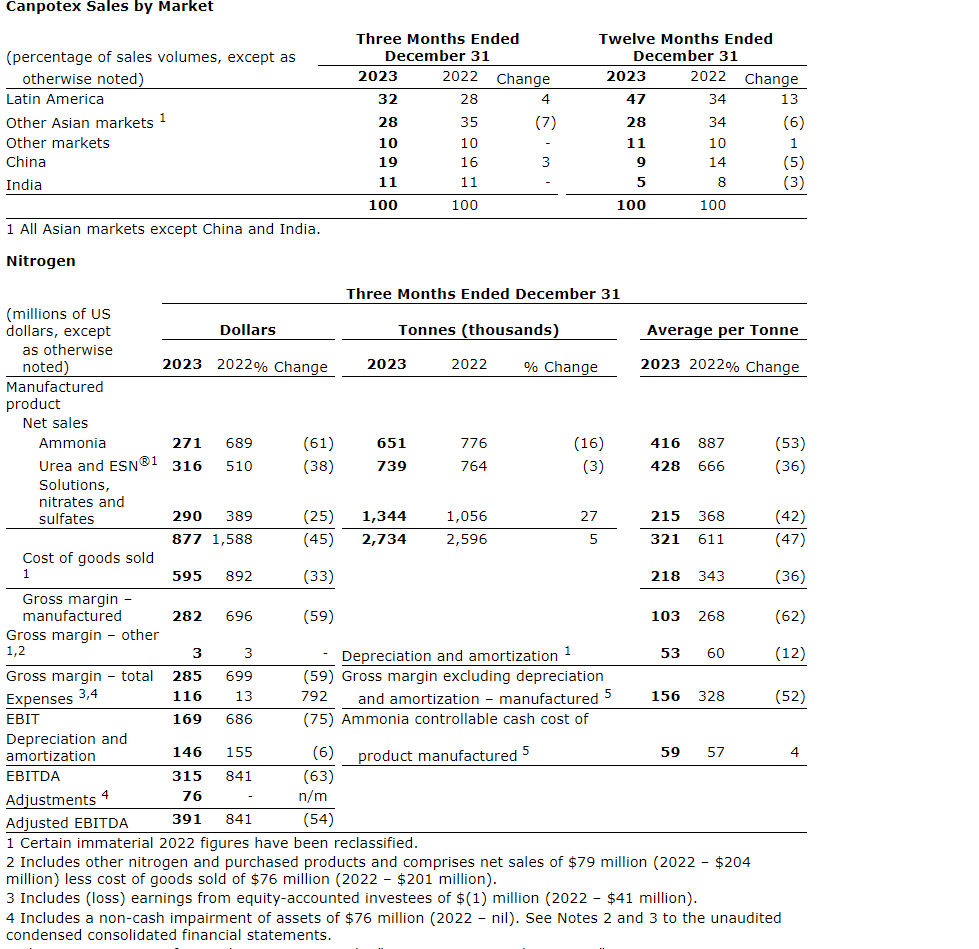 Nitrogen full year 2023 adjusted EBITDA decreased to $1.9-billion due to lower net realized selling prices for all major nitrogen products, which more than offset lower natural gas costs and higher sales volumes.