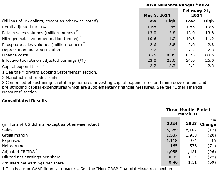 "We expect growth in retail earnings and fertilizer sales volumes compared to the prior year and have maintained our 2024 guidance ranges. Our focus remains on strengthening our capability to serve growers and enhancing our core businesses to improve the quality of our earnings and free cash flow," added Mr. Seitz.