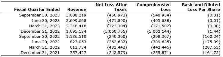 The company has experienced dramatic user growth over the past two years as can be seen by the consistent revenue growth over the past eight quarters. Net loss and comprehensive loss have generally remained comparable from the fourth quarter of 2021 through the current period when looking only at operating expenses, not including the reverse-takeover-transaction-related expenses included in the fourth quarter of 2022 (see 2022 audited annual financial statements).