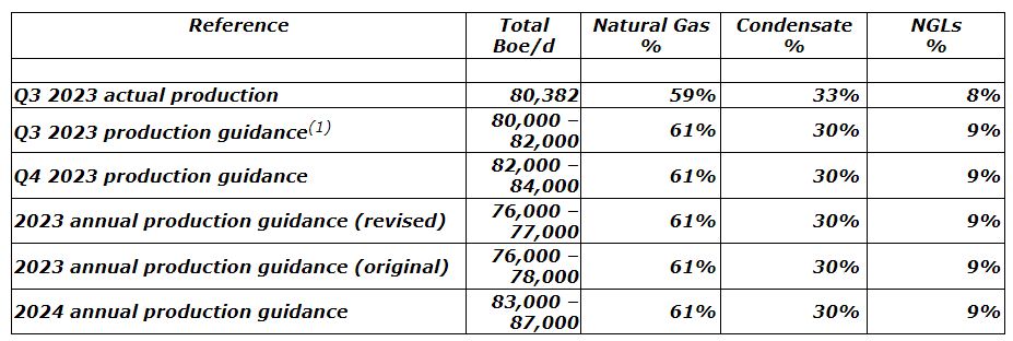 Produced a record average of 80,382 boe/d (barrels of oil equivalent per day), meeting its guidance expectations and reflecting a 17-per-cent increase in production from the third quarter of 2022. The production composition for the third quarter was richer than expected at 33 per cent condensate, 8 per cent NGLs (natural gas liquids) and 59 per cent natural gas, and this included approximately 3,500 boe/d of planned and unplanned mid-stream and NuVista downtime;