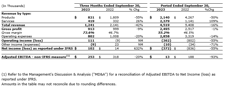 At $4.5-million, revenue for the period was 16 per cent lower than last year. However, improved gross margin (55.2 per cent versus 46.5 per cent) and a 14-per-cent reduction in operating expenditures resulted in only a small reduction ($22,000) in gross profit. The shift in product/service mix in 2023 was instrumental in the improved gross margins and net income loss compared with the same period in 2022.