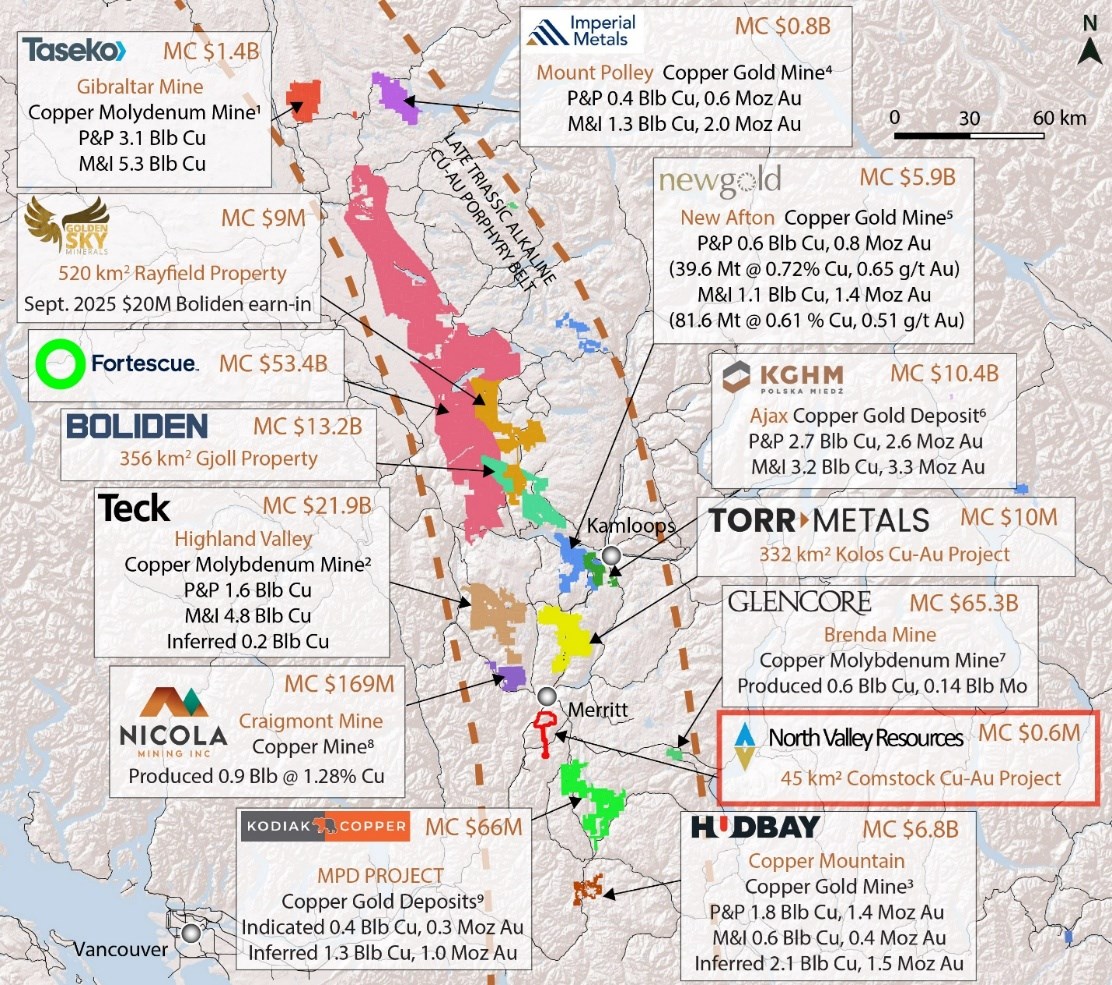 Kamloops, British Columbia--(Newsfile Corp. - April 15, 2026) - North Valley Resources Ltd. (CSE: NVR) ("North Valley" or "The Company") is pleased to report results from recent Short-Wave Infrared (SWIR) spectral analysis on 78 rock chip samples across five historic mineral showings at its drill-permitted ~4500 ha Comstock Copper-Gold Project in southern British Columbia. The Project is strategically located adjacent to the Coquihalla Highway, approximately 10 kilometres (km) south of Merritt, within close proximity to major operating copper mines including Highland Valley, Copper Mountain, and New Afton; as well as recent significant nearby discoveries such as Kodiak Copper's MPD property and Westhaven Gold's Shovelnose project.