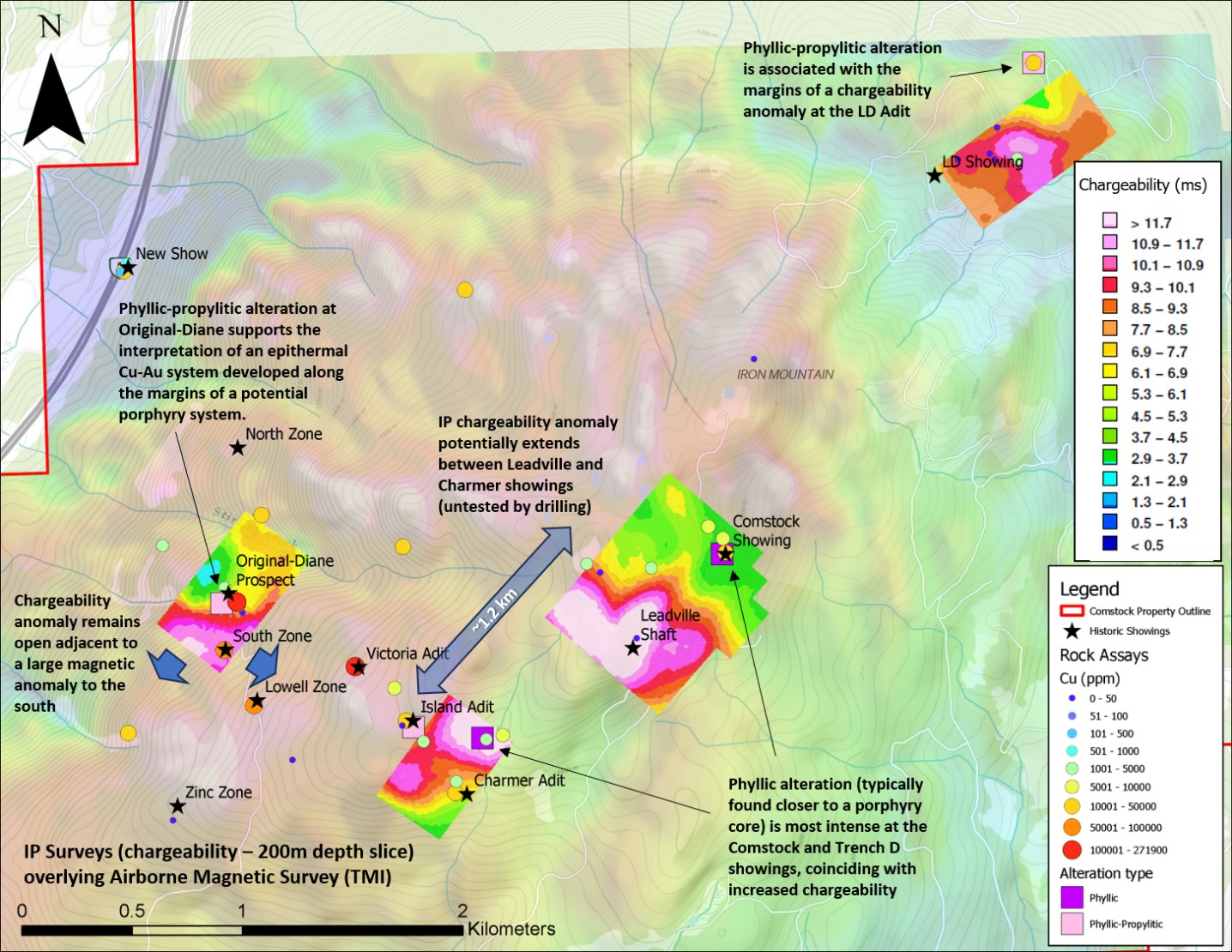 Exploration Footprint Refined: Lower WMX values at historical showings (Original Diane, Island, LD Adit) mark areas more distal from the heat source, corresponding to the margins of a large chargeability anomaly. This refines the exploration footprint, focusing on higher-priority central targets defined by chargeability anomalies. Historical drilling at Original-Diane, limited to the anomaly margins, returned encouraging results, including 0.53% Cu and 0.36 g/t Au over 12.8 m, 0.49% Cu and 0.52 g/t Au over 8.23 m, and 0.38% Cu and 0.72 g/t Au over 13.99 m (see January 20, 2026 news release).