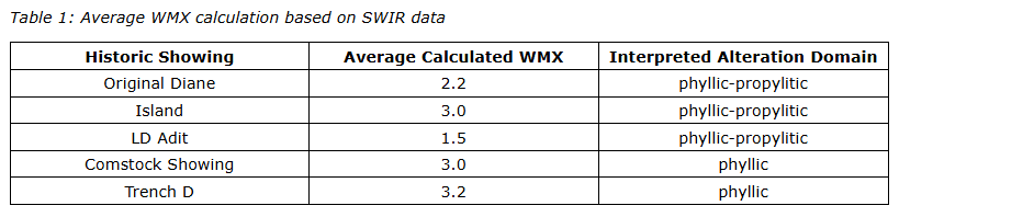 - Clear vector toward the core of the system: Elevated white mica crystallinity (WMX approximately 3.0 to 3.2) at Comstock showing and Trench D reflects increasing thermal intensity (Table 1), vectoring toward the hydrothermal heat source where mineralization can be further concentrated. Historical high-grade rock grab samples support this, returning up to 27.1 per cent copper (Cu) and 56 grams per tonne gold (Au).