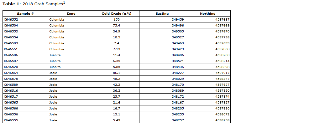 A reconnaissance program conducted in 2018 focused on three zones -- Columbia, Juanita and Josie. A total of 68 rock geochemical samples were collected during the program. Thirty-five of the 68 rock and/or chip samples collected returned greater than one g/t gold (see Table 1). Significant rock sample results are listed below: