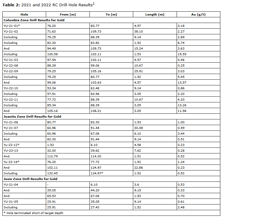 - Drill results: Recent exploration at the Columbia zone has intersected mineralization, including 2.27 g/t gold over 38.1 m (hole YU21-02) and 11.96 g/t gold over 3.05 m (hole YU22-11).Other recent and notable drill holes include: