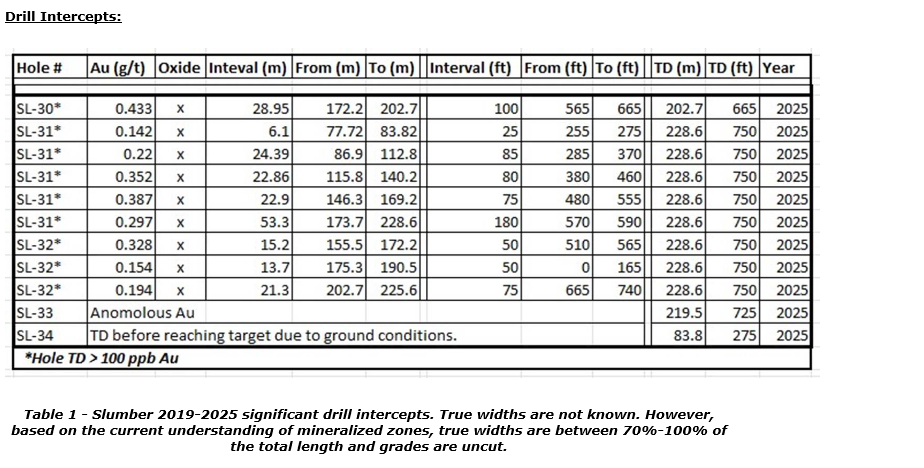 John Watson, NV Gold's chief executive officer, commented: "The Slumber project continues to expand with our work in 2025. Hole SL-30 was drilled 1.7 km north of our previous drilling and hole SL-31 was completed 0.33 km north. Both holes returned highly encouraging intercepts of gold mineralization and both bottomed in grade. The 2025 program results suggest that the oxide gold system is much larger than previously established, with potential to be a major discovery."