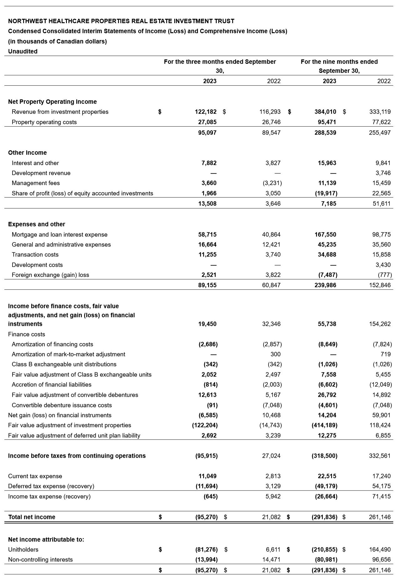 - Q3 2023 net loss attributable to unitholders of $81.3-million as result of fair value loss on investment properties;