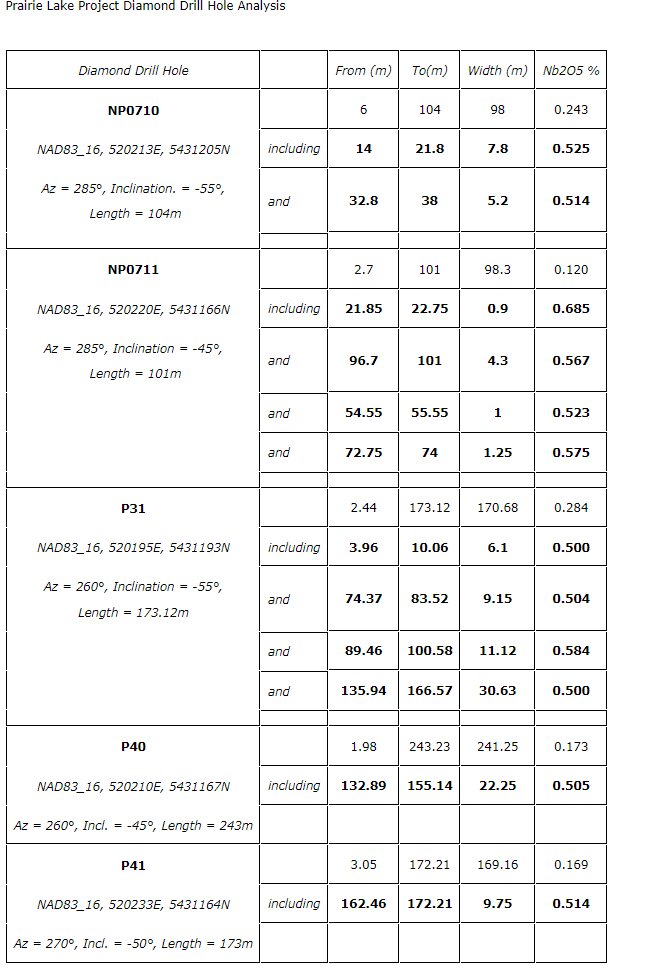 "The extension of this niobium-bearing domain to depth is just one indication of the potential to expand the scope of Prairie Lake over and above the phosphate -- rare-earth element dominated mineral resource estimate (MRE) completed last year," said Paul Jones, Nuinsco's chief executive officer. "We understand that the entire Prairie Lake complex is mineralized with elements and minerals of economic interest and that it remains vastly underexplored. We are aware of strong niobium mineralization occurring elsewhere on the project, and the very prospective grades and intervals identified from drilling identifies the potential to expand the importance of niobium at Prairie Lake. The significance of niobium in the developing greener economy makes it a very valuable addition the project's potential."