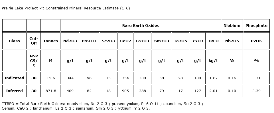 The Prairie Lake project contains a large, well-located resource of critical minerals in North America. It contains significant grades of phosphate mineralization (in apatite) REEs and niobium (in pyrochlore). The current size of the project MRE is very large -- in the order of 900 million tonnes (see attached table). The project has amongst the world's highest known light rare earth element content in apatite and contains a host of other REE-bearing minerals; it also contains a significant endowment of niobium-bearing pyrochlore and phosphate mineralization. The project is a potential source of elements needed for use in transportation, power distribution, green industries, and a host of other technologies and applications, including agriculture. The current MRE is already a very large endowment of vitally important critical minerals that are in constantly expanding demand as the world's economies transition toward low-carbon emissions.