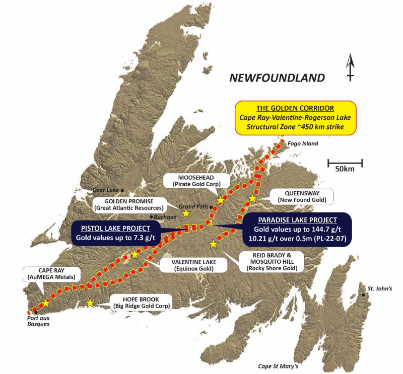 Located on the Dunnage Zone litho-tectonic domain of Central Newfoundland the mineralization at the Project is interpreted to be related to the Cape Ray–Valentine Lake structural zone and the Victoria Lake Fault Zone. These structures are associated with much of the gold mineralization in central Newfoundland, including Equinox Gold’s flagship Valentine Lake gold deposit, and the Moosehead Property operated by Pirate Gold. The Paradise Lake project encompasses an underexplored land package with approximately 10 km of strike length within this highly gold-prospective terrane.